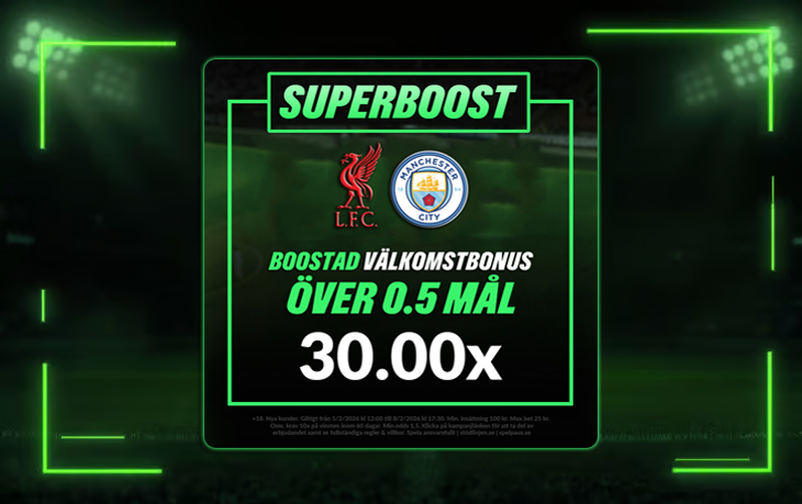 Vi kan tillsammans med ComeOn erbjuda alla nya kunder en exklusiv oddsboost till söndagens toppmöte i Premier League, Liverpool mot Manchester City. Få boostade oddset 30.00 på att det blir minst 1 mål i matchen!