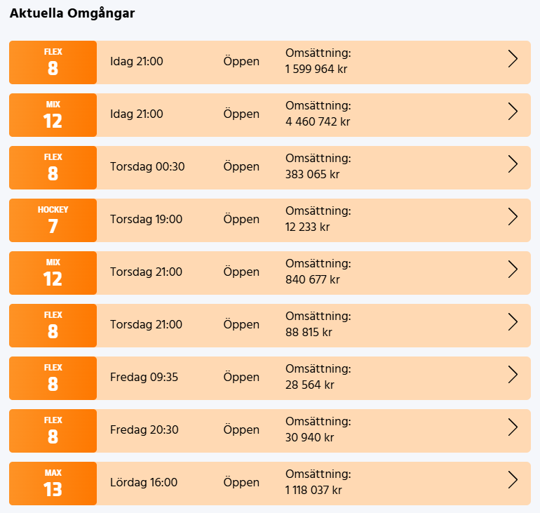 Föredrar du bättre odds i utbyte mot lite lägre jackpottar är det i stället Flex 8 eller Hockey 7 du ska spela. De betalar då lite mindre men även dessa har haft jackpottar uppskattade till 1 miljon kr respektive 100 000 kr. Vill du öka vinstpotentialen kan du alltid lägga till en vinstmultiplikator på 1X, 2X, 3X, 5X eller 10X.